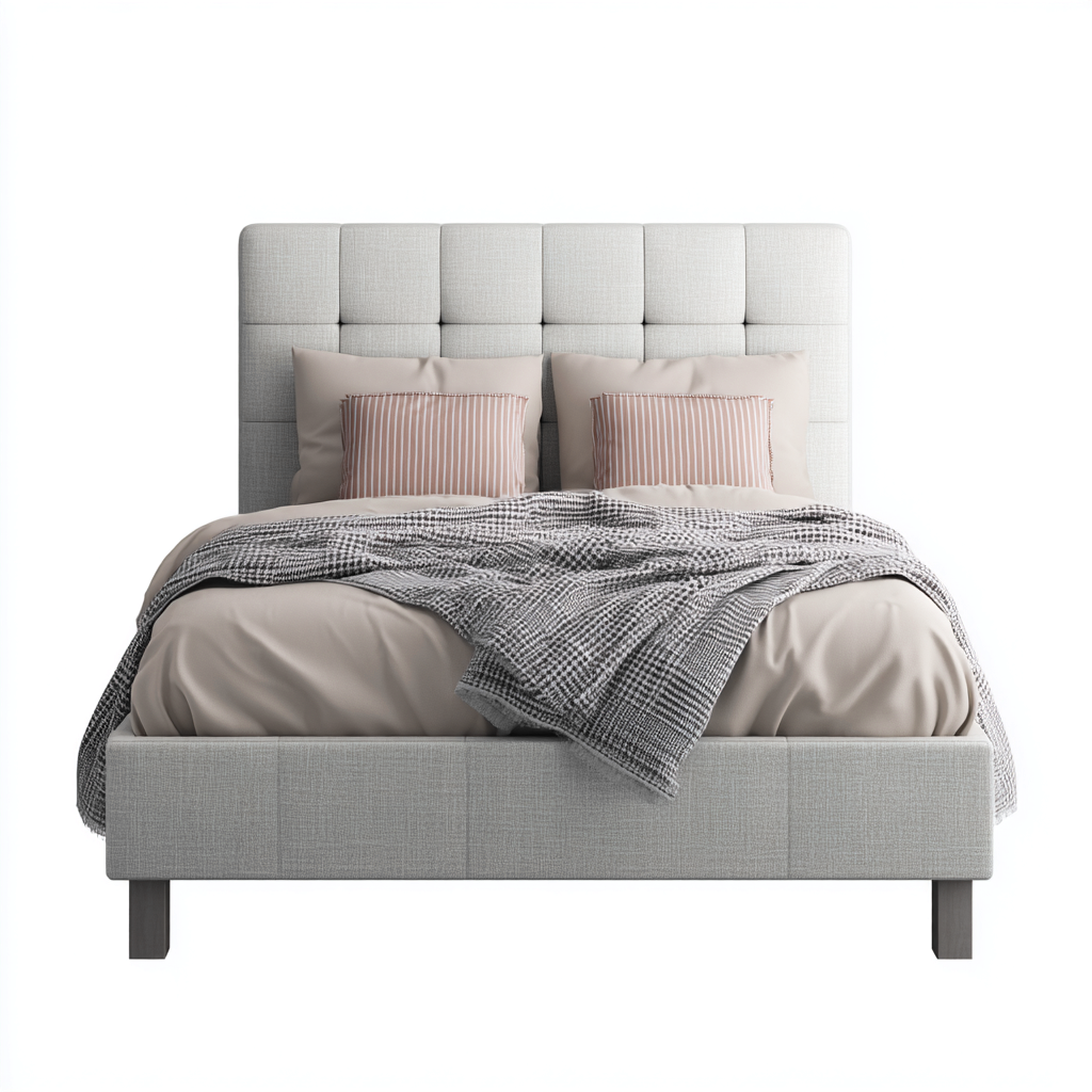 La structure est revêtue d'un tissu beige à la texture douce et régulière. Le cadre robuste assure stabilité et durabilité, tandis que la finition capitonnée de la tête de lit enrichit son esthétique.